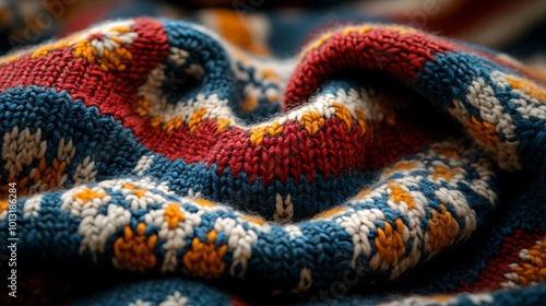 © DIAHIMAGESNEW, Fototapeta premium Close up of a soft, colorful knitted fabric with a textured pattern.