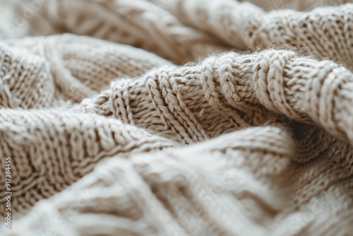 © Victor Bertrand, Fototapeta premium Close-up of a soft, cream-colored knitted fabric with intricate patterns, capturing the warmth and texture.