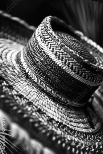 © vefimov, Obraz premium Close up of a sombrero hat with beaded trim and straw elements. Fashion accessory.