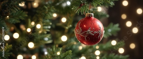 Obraz premium Close-up of a sparkling ornament on a Christmas tree branch with blurred...