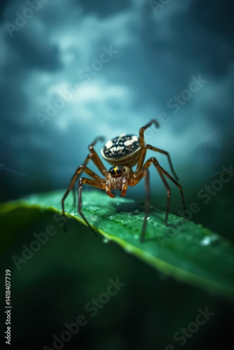 © Photique, Fototapeta premium Close-up of a spider on a leaf in dramatic lighting.