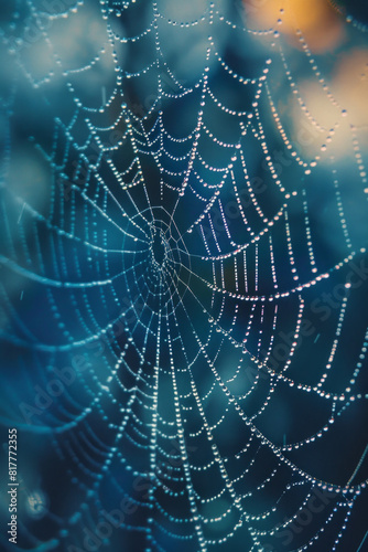 Naklejka premium Close-up of a spider web covered in morning dew, highlighting the intricate...