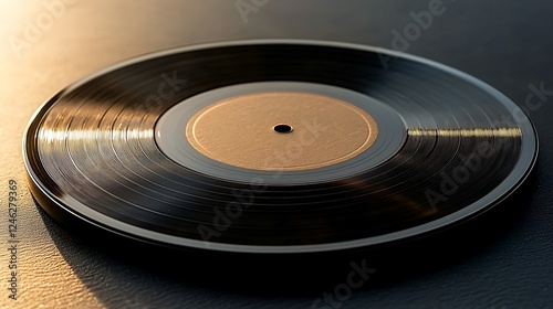 Obraz premium Close-up of a spinning vinyl record on a smooth surface with warm lighting,...
