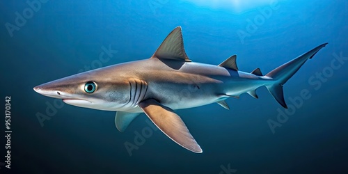 © Man888, Fototapeta premium Close-up of a Spiny Dogfish, a small, brownish-gray shark with a distinctive spiny dorsal fin and pointed snout, swimming in a dark blue ocean.