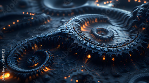 © TUL, Naklejka premium Close up of a spiral pattern on a black surface with dramatic abstract design elements