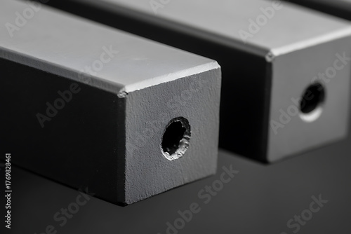 © A2Z AI , Obraz premium Close-up of a square metal bars with centered holes, showcasing industrial design and precision engineering. The monochromatic palette adds a touch of sophistication.