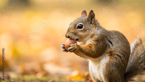 © MIkrom, Fototapeta premium Close Up Of A Squirrel Eating A Nut With Autumn Foliage In The Background