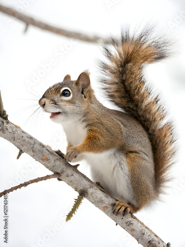 © IrenKa, Fototapeta premium Close-up of a squirrel sitting on a tree branch, isolated on white background in winter, with curled fluffy tail