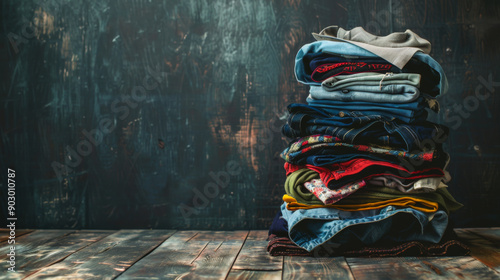 © Alina Tymofieieva, Obraz premium Close-up of a stack of clean clothes on a wooden shelf against a dark background. Copy space.