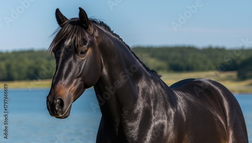 Obraz premium Close-up of a striking black stallion by a serene lake, emphasizing the...