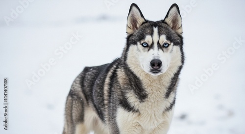 Fototapeta premium Close-up of a striking Siberian Husky dog in a snowy landscape, showcasing...