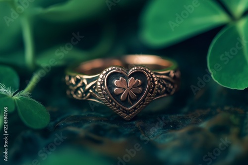Fototapeta premium Close up of a stunning claddagh ring featuring a four leaf clover, resting on...