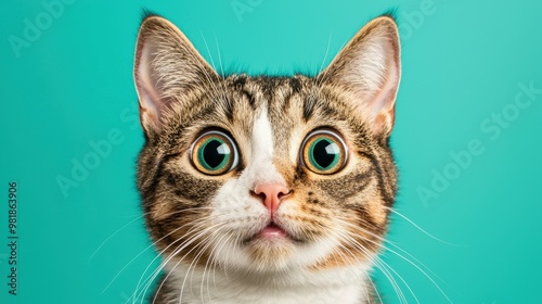 © Narongsag, Obraz premium Close up of a Surprised Cat with Green Eyes Against a Turquoise Background