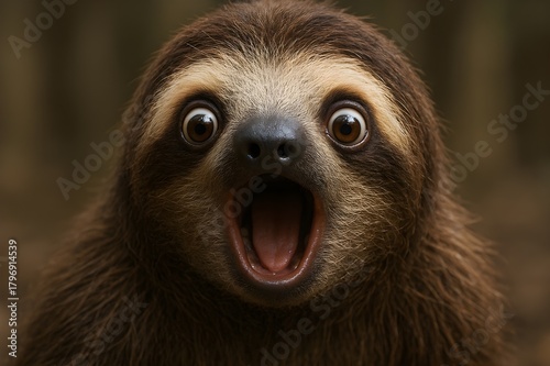 © startang141, Naklejka premium Close-up of a surprised sloth with wide eyes and an open mouth, looking directly at the camera with a shocked expression.