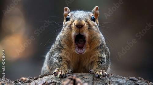 © S.Stock, Obraz premium Close-up of a surprised squirrel with its mouth wide open, perched on a tree trunk.