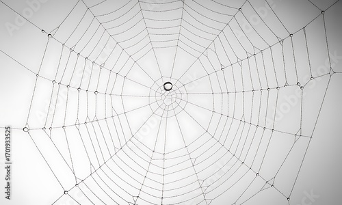 © DhanaStudio, Obraz premium Close-up of a symmetrical spider web with water droplets on threads against white background