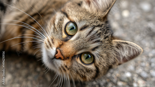 Naklejka premium Close-up of a tabby cat with striking green eyes, showcasing its expressive...