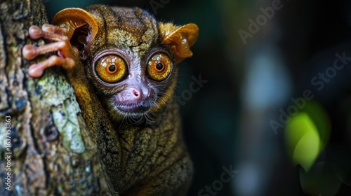 Fototapeta premium Close-up of a Tarsier clinging to a tree