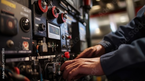 © Justlight, Obraz premium Close up of a technician's hands skillfully operating an industrial control panel, featuring an array of buttons, switches, and a digital display, highlighting expertise in a technical environment