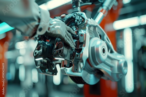 © NikoG, Fototapeta premium Close up of a technician working on an electric car brake