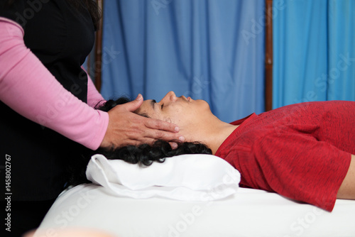 Fototapeta premium Close up of a therapist placing hands on patient's head during reiki session...