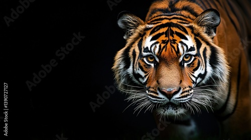 Naklejka premium Close-up of a tiger's face on black background, blurred head