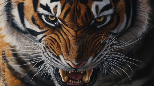 © Penatic Studio, Naklejka premium Close-up of a tiger's face with its mouth open, showing teeth and a menacing expression