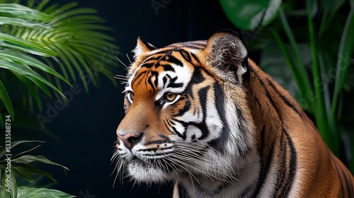 © adniluy, Fototapeta premium Close-up of a tiger's head, profile view, in a lush jungle setting.