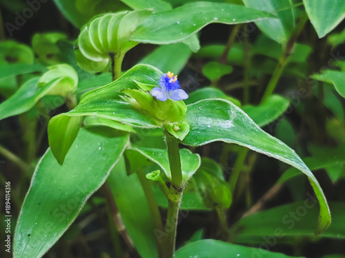 © Permahdi666, Obraz premium Close-up of a tiny blue Commelina Diffusa flower blooming in a lush greenery