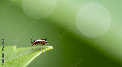 Fototapeta premium Close-up of a Tiny Bug on a Green Leaf with Soft Bokeh Background, Captured in Detail