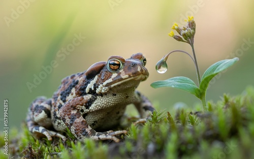 © StudioBackground, Fototapeta premium Close-up of a Toad with a Water Droplet on a Delicate Flower