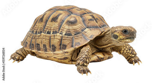 © Best, Obraz premium Close-up of a tortoise moving slowly across a white background with detailed shell patterns