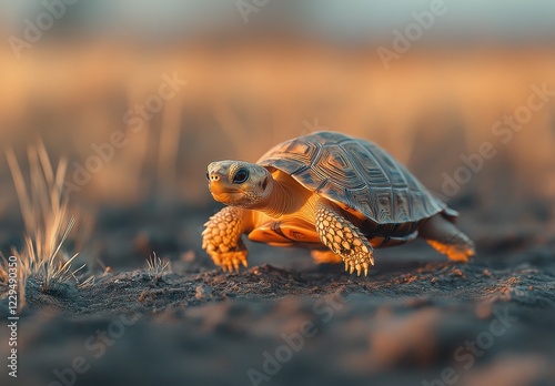 © ANUAR, Obraz premium Close-Up of a Tortoise Walking on Dry Ground with Golden Hour Lighting Highlighting Its Shell and Texture in a Natural Outdoor Environment