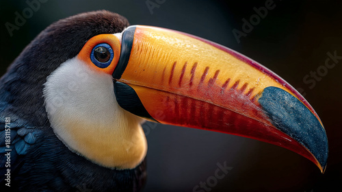 © Sadia, Fototapeta premium Close up of a toucan bird with a large colorful beak and bright blue eye on a dark background