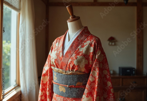 © abu, Naklejka premium Close-up of a traditional Japanese kimono on a wooden mannequin