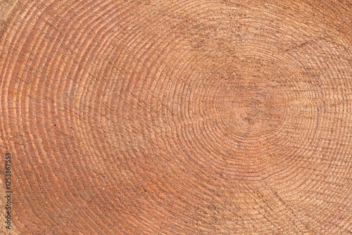 Naklejka premium Close-up of a tree trunk cross-section exhibiting annual growth rings. The rings vary in size and width and are predominantly light brown, indicating periods of tree growth.