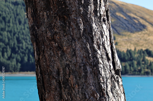 © Alberto, Fototapeta premium Close up of a tree trunk with a lake background