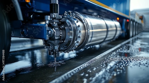 © otwdesign, Fototapeta premium Close-up of a Truck's Hydraulic System Discharging Water