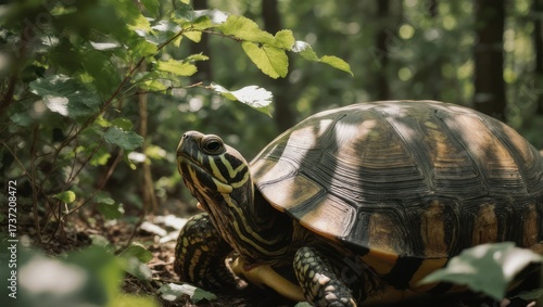 © Kecik, Obraz premium Close-up of a turtle in a lush green forest, bathed in dappled sunlight.