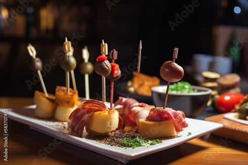 © Nedrofly, Fototapeta premium Close-up of a typical basque pincho or tapa made of salmon and crayfish in a bar of Vitoria, Basque Country, Spain