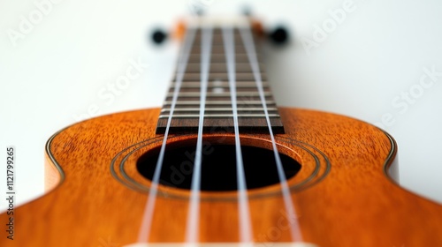 © logyartstudios, Fototapeta premium Close-up of a ukulele, showcasing its strings, soundhole, and body against a white background.