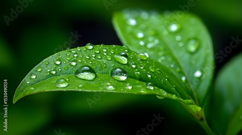 Fototapeta premium Close-up of a verdant green leaf covered in glistening dew drops, conveying a...