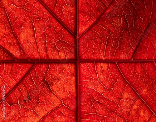 © Jaki, Fototapeta premium Close-up of a vibrant, autumn leaf showing its intricate veined structure. The red hues are intense, illuminated