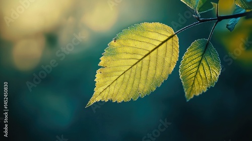 © Andi, Obraz premium Close-up of a vibrant autumnal leaf on a branch.