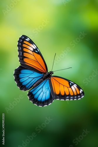© JP STUDIO LAB, Naklejka premium Close-up of a vibrant blue and orange butterfly in mid-flight, showcasing its intricate wing patterns and delicate beauty