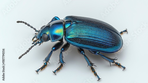 © Pc, Fototapeta premium Close-up of a vibrant blue iridescent beetle isolated on white background.