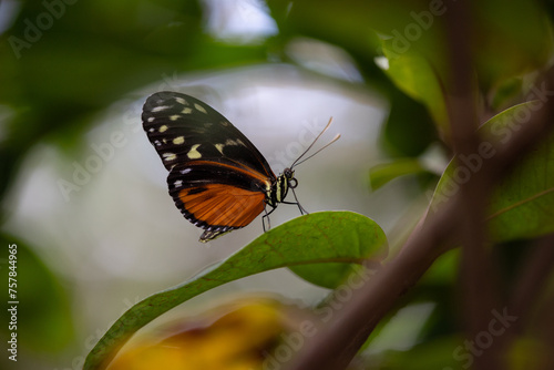 © Wirestock, Naklejka premium Close-up of a vibrant butterfly on a leaf surrounded by lush greenery.