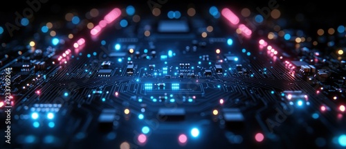 Obraz premium Close-up of a vibrant circuit board with glowing lights