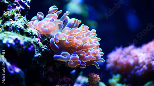 Fototapeta premium Close-up of a vibrant coral reef with blue, orange, and purple hues.