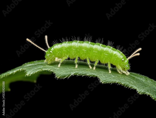 © darion, Naklejka premium Close-up of a vibrant green caterpillar resting on a leaf against a dark background